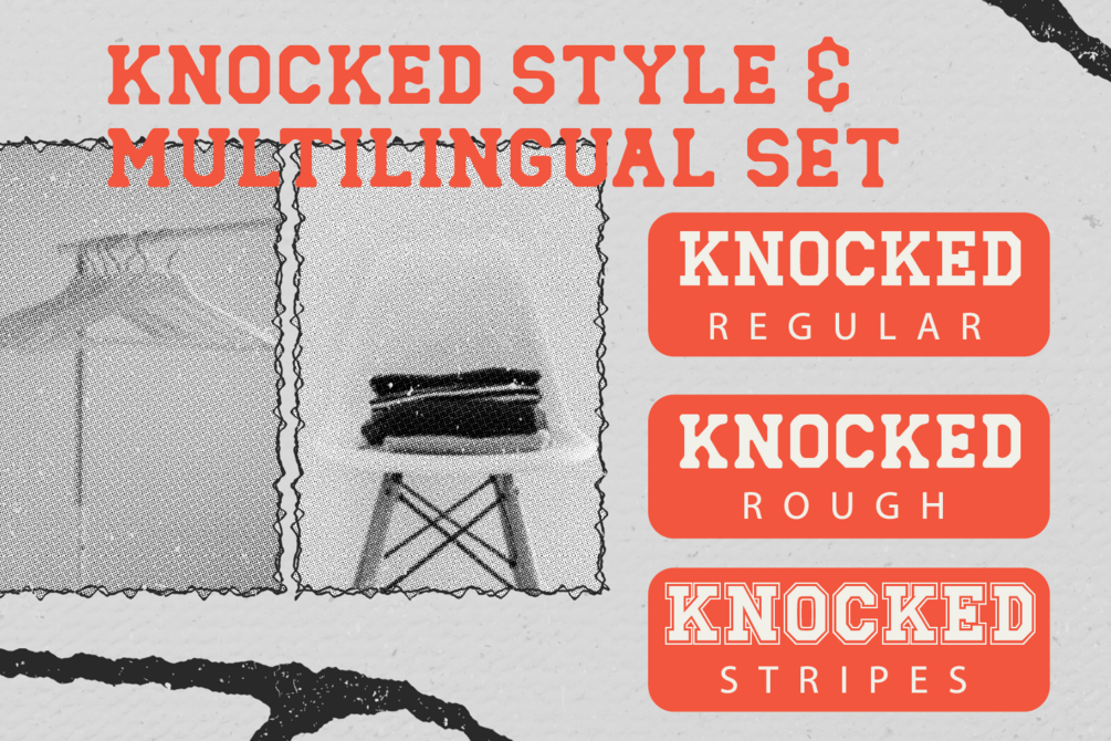 Knocked fonts is have a inspiration like Collage fonts, Varsity fonts, Athletic fonts and Retro fonts.
